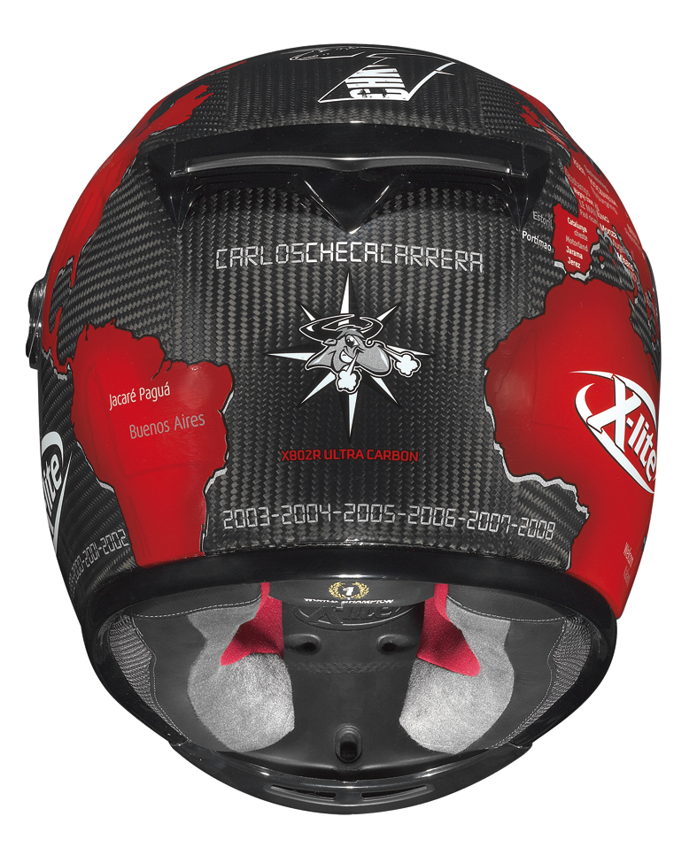 Alle parole di Alberto Vergani, Presidente di Nolangroup ha fatto subito eco il commento di Carlos: “Vorrei ringraziare Nolangroup per questo casco veramente speciale che coincide con il ventesimo anniversario della mia partecipazione al Campionato del Mondo. Mantenendo la grafica del mappamondo, che riflette la mia carriera sportiva, abbiamo evidenziato tutti i circuiti sui quali ho gareggiato e altri dettagli che lo legano, a mio parere, al mondo delle corse”.