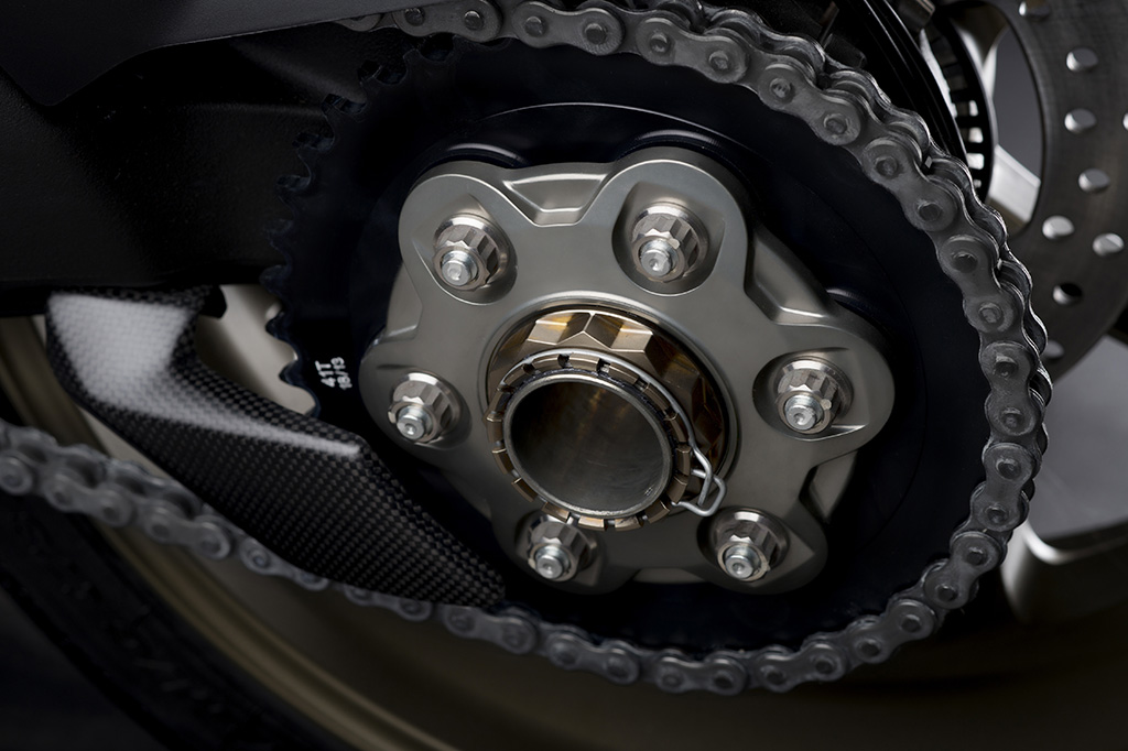 La riduzione di peso è poi portata all’estremo grazie al telaietto posteriore e carena in carbonio, batteria agli ioni di litio e all’impianto di scarico interamente realizzato in titanio così come parte delle viti veicolo e motore. Tra le altre straordinarie novità, la leggerissima forcella Öhlins FL916 con piedini interamente lavorati alla macchina e la sospensione posteriore Öhlins TTX36 con molla in titanio. I freni Monoblocco Brembo M50 della Superleggera ereditano dal mondo racing la pompa radiale anteriore MCS 19.21 e la regolazione in remoto per la prima volta utilizzati su una moto di produzione, con ottimizzazione della trasmissione secondaria grazie alla leggerissima corona in ergal e catena di trasmissione 520 seguendo le specifiche tecniche del Mondiale Superbike. La maniacale attenzione per i dettagli traspare dalla conformazione della carena in carbonio, modellata secondo il profilo ad alta penetrazione normalmente associato all’appendice aerodinamica “Aero-kit” disponibile per i modelli “R”.