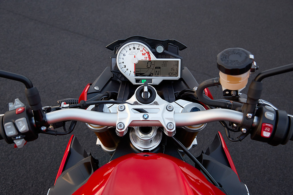 Infine, la S1000 R si è ispirata al mondo delle corse anche nel disegno del cockpit. Uno schermo LC con contagiri analogico permette di avere una varietà d’informazioni unica nel segmento di appartenenza, dall’indicazione della marcia inserita alla visualizzazione della modalità di guida, fino alla registrazione dei lap-time. Per ottimizzare i cambi-marcia sono state integrate a bordo delle shiftlights a programmazione individuale.