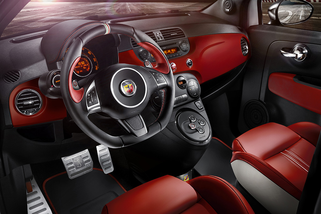 Anche gli interni sono stati rivisti, con una cura dei dettagli fino ad ora sconosciuta: sedili sportivi in pelle rossa con inserti bianchi e cuciture rosse rievocano la Abarth del 1963…..