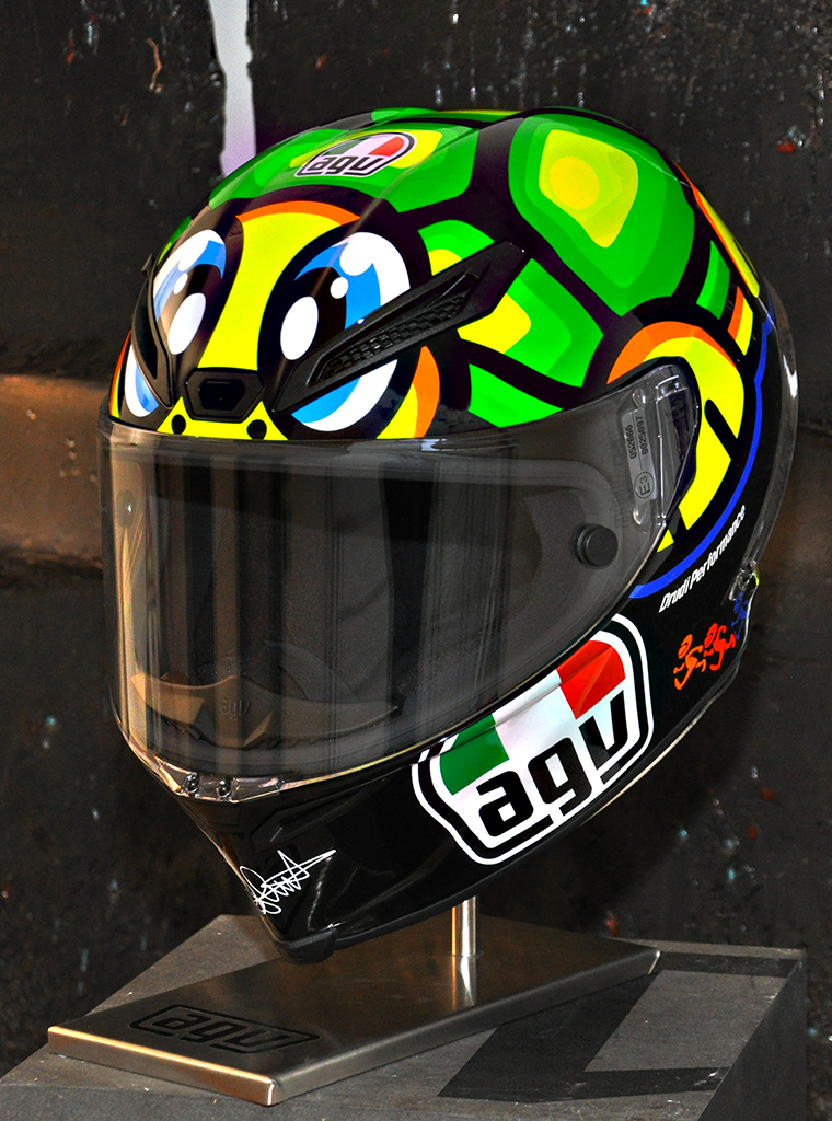 Il casco tartaruga è la celebrazione del casco che Valentino Rossi ha indossato in un Gran Premio del Mugello, MotoGP, ricco di ricordi.