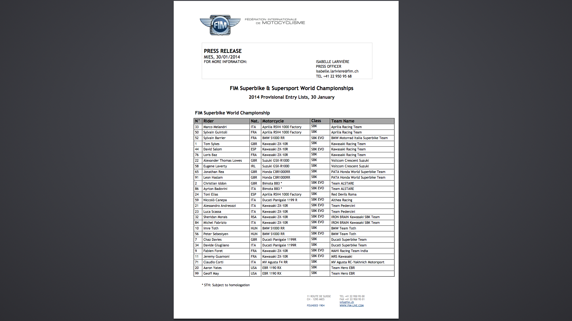 Da segnalare anche la presenza di un pilota Campione della Moto2 quale Toni Elias, che forte di un esperienza anche con il Team LCR in MotoGP, sarà il portabandiera dell’unico team privato in SBK, il Team Red Devils; in sella ad una Aprilia RSV4 Factory il pilota spagnolo vanta una incredibile esperienza nel mondo delle corse!
