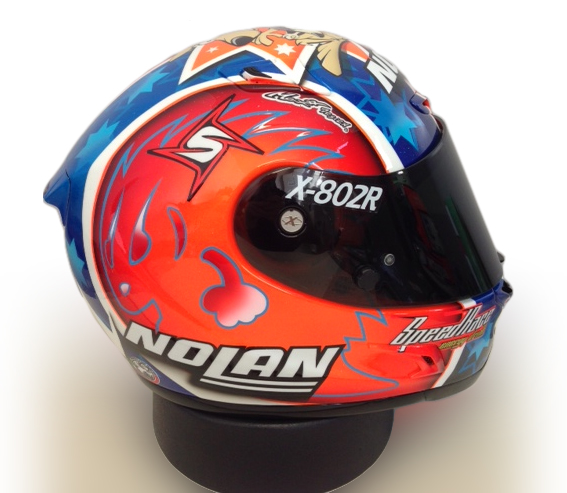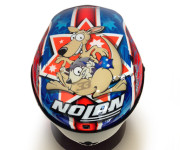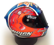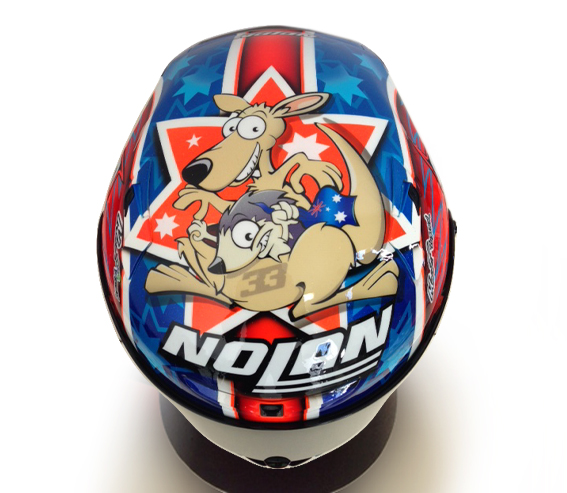 Il casco Nolan replica Melandri si base sulla fortunata serie Nolan X-802R: i colori sono quelli che Marco indossava ai tempi della vittoria del mondiale proprio con Aprilia, un casco che segna la ripartenza del pilota proprio dall’Australia, dal circuito di Phillip Island, teatro dell’imminente inizio della stagione 2014 del Campionato Mondiale della Superbike.