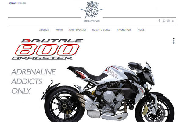 Dinamico e veloce il sito ufficiale MVAgusta.it offre interessanti sezioni dove vengono svelati i segreti di ogni sua moto: dalle informazioni tecniche ai dettagli su motore e dotazione, ciclistica ed elettronica, il tutto corredato da video ed immagini ad alta definizione.