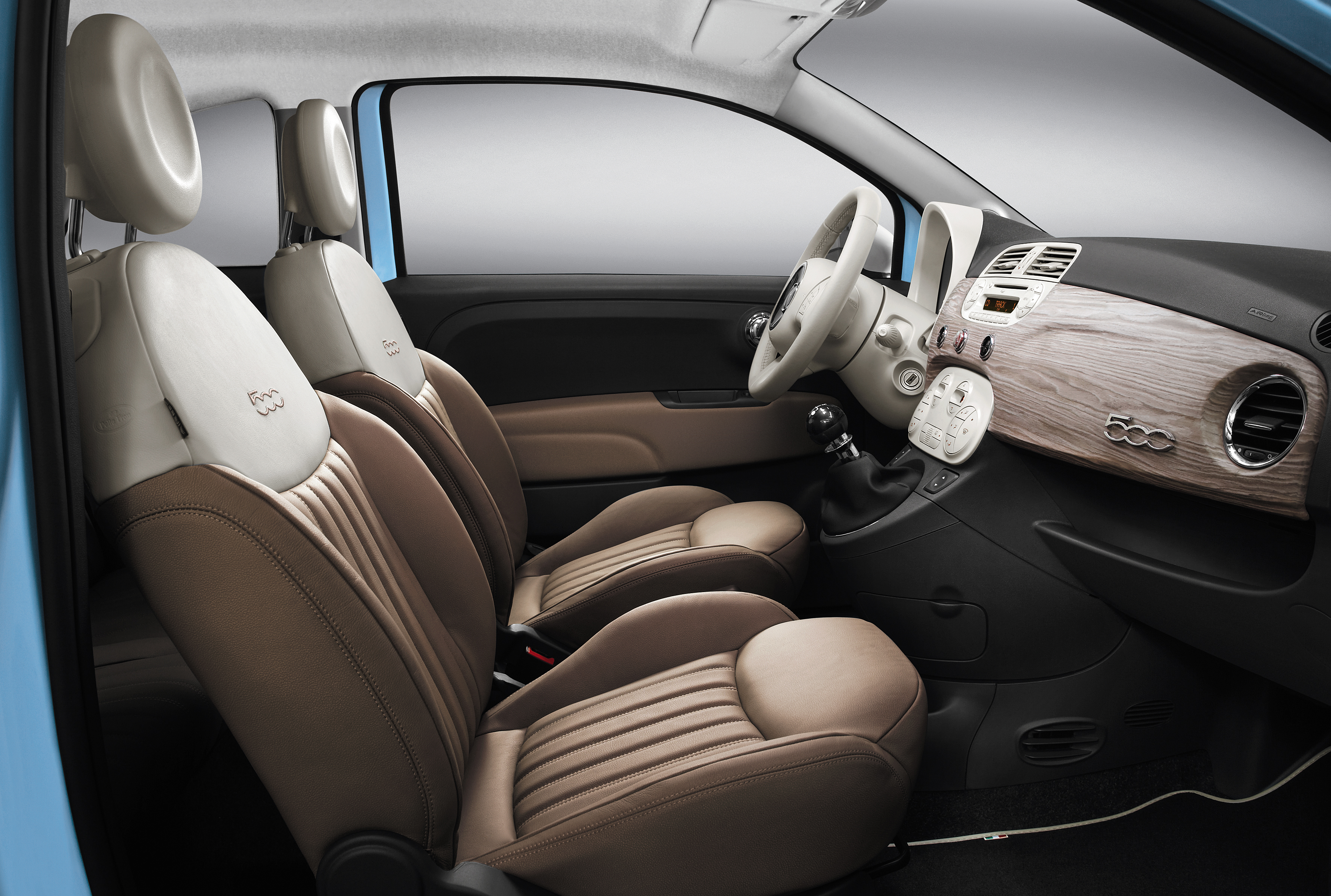 Per quanto concerne gli interni la plancia è impreziosita con legno poro aperto mentre i sedili presentano un elegante selleria in pelle Frau tabacco bitonale con inserti a mezzaluna in pelle avorio con ricami 500 in tinta tabacco.
