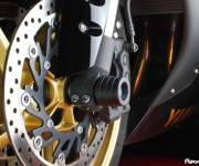 – Pinze freno monoblocco ricavate dal pieno (AGPZ01) con corpo Pinza in Ergal 7075 T6, 4 pistoni in titanio T6 autoventilati del diametro di 34 mm, interasse 108 mm-Off-Set 22,5 mm (Team Kawasaki Mahi Racing India/SBK Evo (Pilota Fabien Foret))