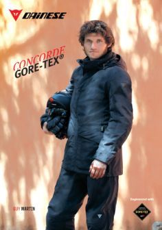 Per il segmento city Dainese invece propone la giacca CONCORDE GORE-TEX che, dotata di membrana GORE-TEX laminata al morbido tessuto esterno, consente una rapida asciugatura riducendo l’effetto wind-chill. Grazie alle eccezionali protezioni morbide Pro-Shape, costruite in un materiale innovativo in grado di adattarsi perfettamente al corpo e di offrire un rapporto tra assorbimento dell’energia degli impatti e peso nettamente migliore tra i concorrenti, questa giacca con cappuccio è in grado di offrire una vestibilità analoga ai capi non tecnici, mantenendo un volume contenuto in corrispondenza dei protettori.