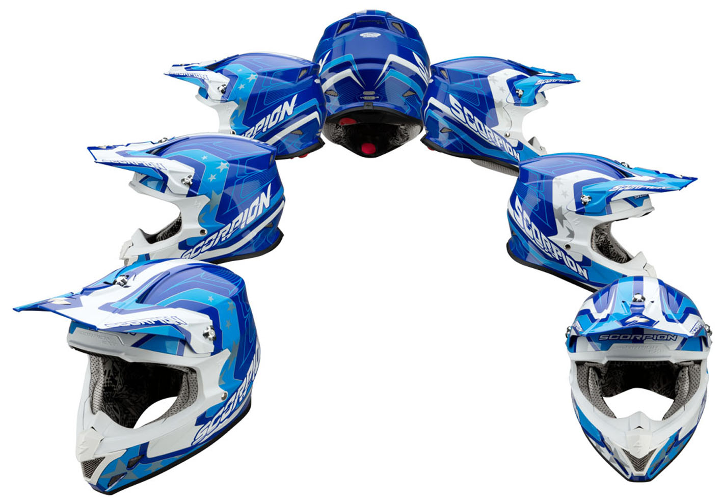 La nuova e bellissima grafica SPACE è disponibile in tre diverse combinazioni colore : Blu/Bianco/Azzurro – Bianco/Rosso/Nero – Giallo neon/Nero/Rosso ed è in vendita presso i concessionari SCORPION-Exo al prezzo di 399,90 euro (iva incl.)