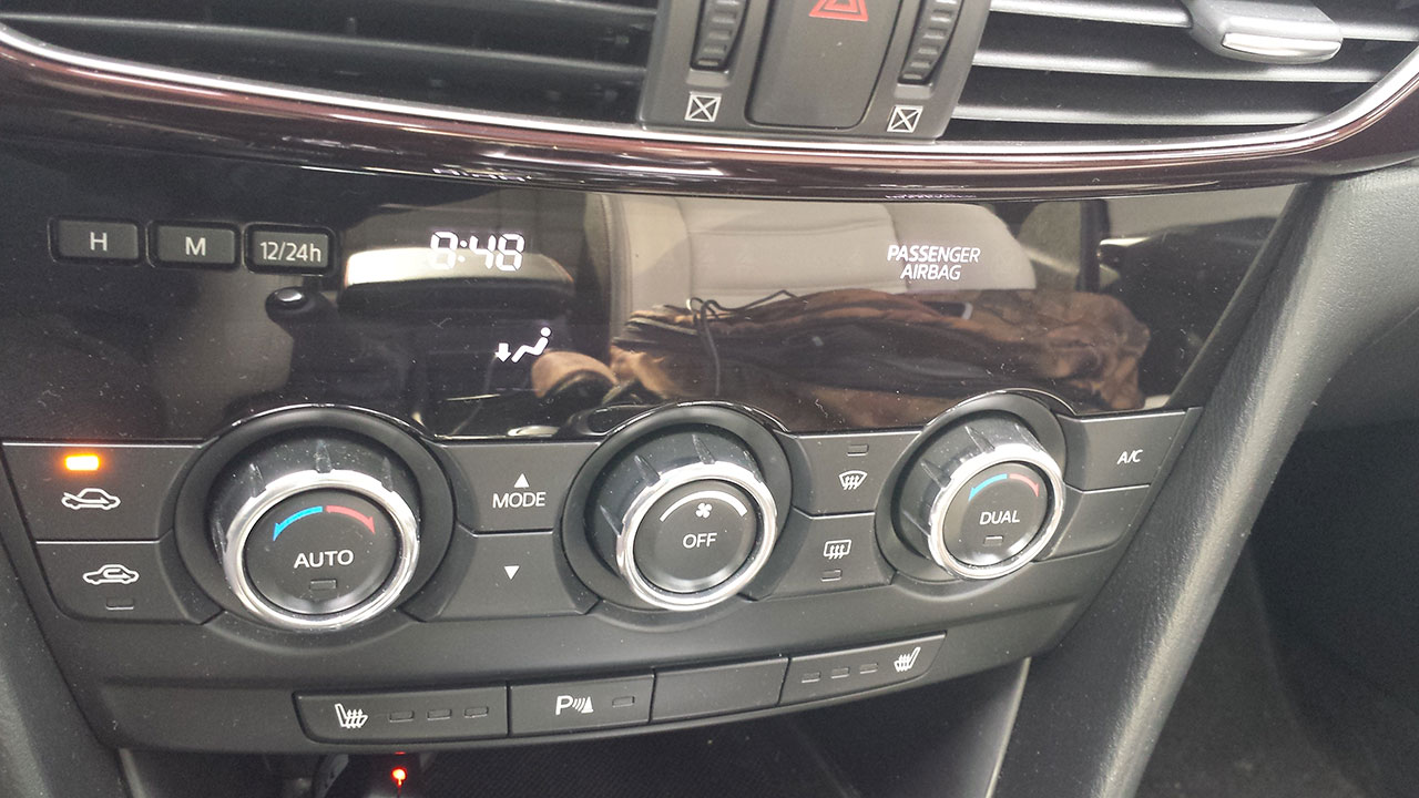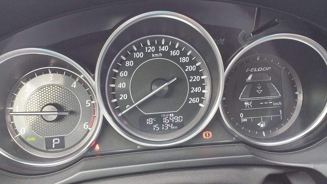 Gli interni sono da vettura premium, i sedili presentano un pregevole rivestimento in pelle e sono dotati di regolazione elettrica; la plancia è tipica Mazda, con il quadro strumenti che incorpora i classici strumenti quali contagiri con indicatore della modalità di marcia ( disponibile in abbinamento al cambio automatico), tachimetro e un display multifunzione che prevede numerose funzioni, quali la distanza dalla vettura che ci precede, l’indicatore carburante, i dati del computer di bordo etc…
