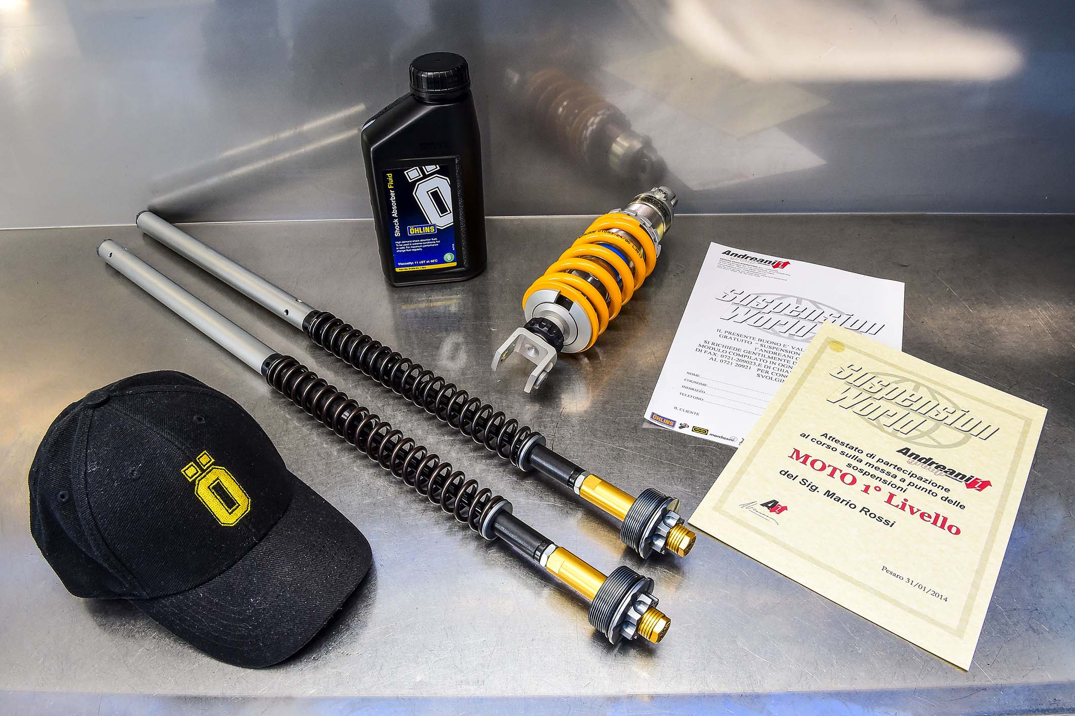 Oltre alla confezione di olio Öhlins specifico per modello, al mono ammortizzatore Öhlins e alle molle forcella Öhlins nel caso del kit Basic o in alternativa pistoni o cartucce Andreani nel caso del kit Advanced, viene dato in omaggio un cappellino personalizzato Öhlins e un buono del valore di 168 € per partecipare al corso sulla tecnica e messa a punto delle sospensioni che gli esperti dell’Andreani Group tengono nell’apposita sala attrezzata.
