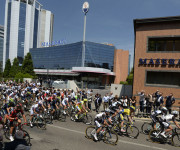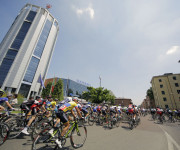 Il passaggio del gruppo dei ciclisti sotto lo striscione del Chilometro Zero è stato festeggiato dai dipendenti della Casa del Tridente, che hanno fatto gioiosa ala al passaggio dei ciclisti e della maglia rosa Cadel Evans.