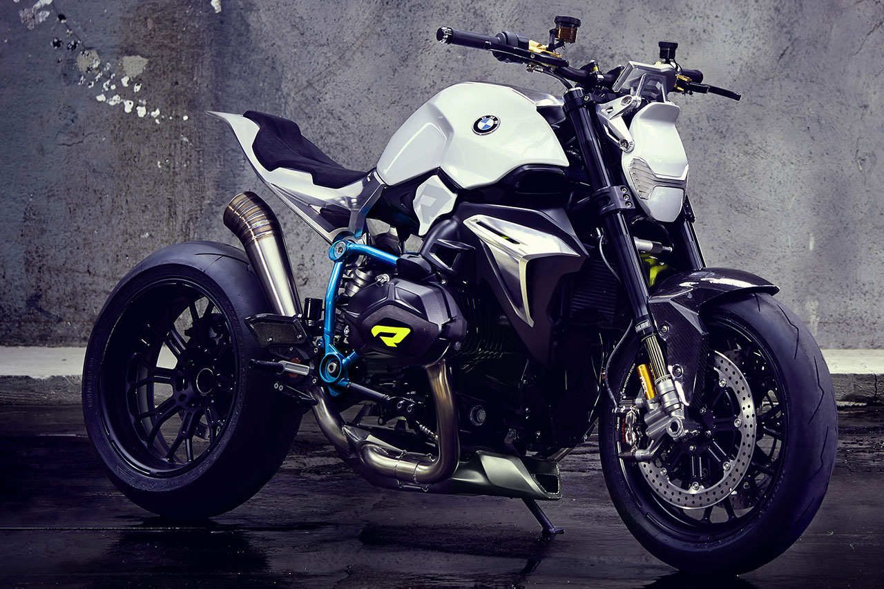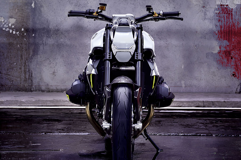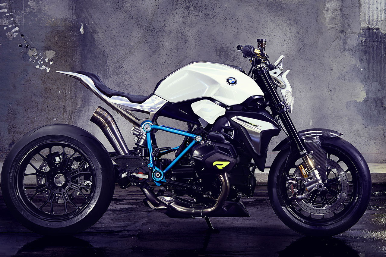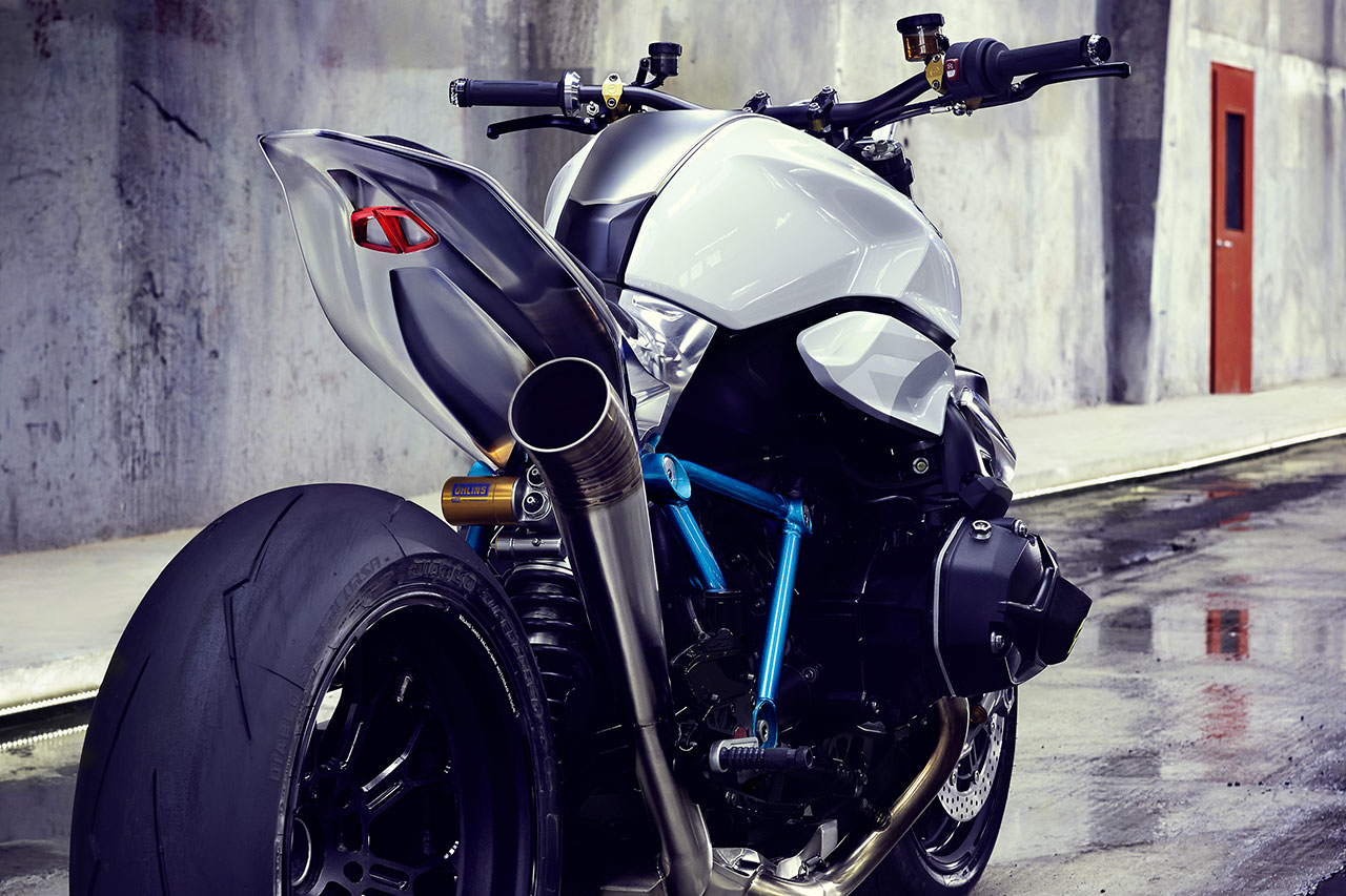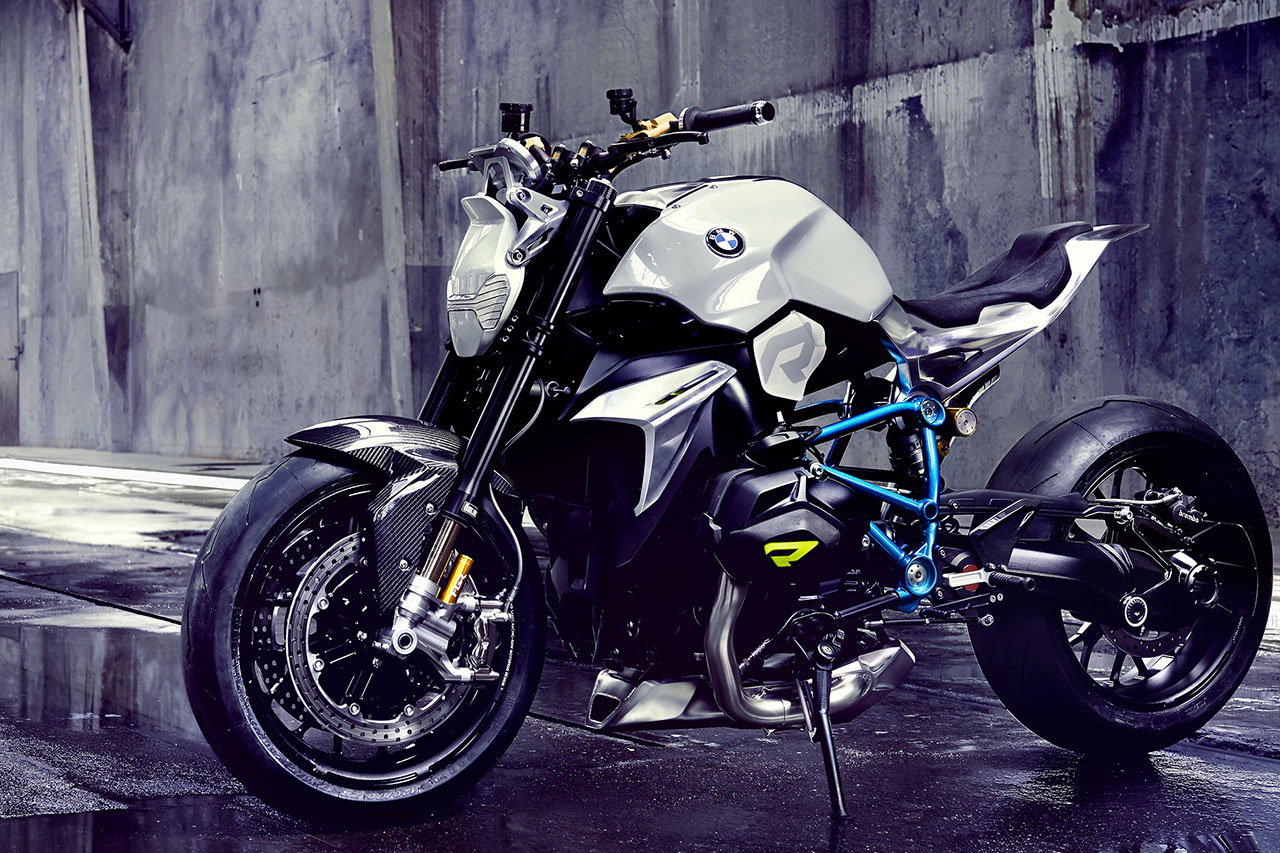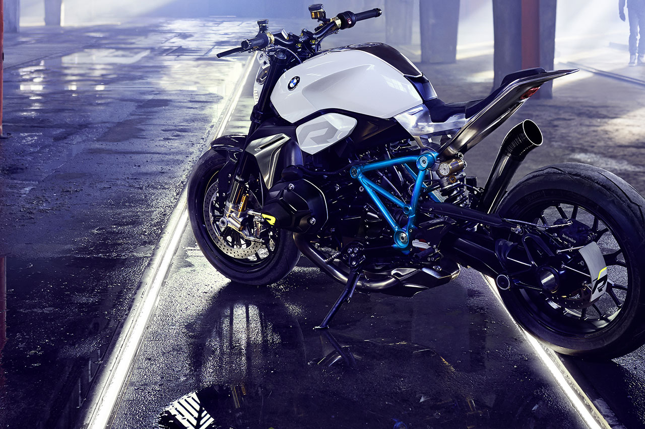 Il motore boxer della BMW ha sempre promesso notevoli prestazioni ed erogazione poderosa ad ogni regime. Nella sua ultima generazione, esso eroga 92 kW (125 Cv) a 7.750 giri/min. da una cilindrata di 1.170 cc, con una coppia massima di 125 Nm a 6.500 giri/min. Dal punto di vista estetico, Il motore della BMW Concept Roadster appare anche perfettamente equilibrato. Le proporzioni compatte, con frontale basso e posteriore alto formano una silhouette a cuneo che esprime il dinamismo anche quando la moto è ferma. La posizione raccolta, con una forte concentrazione verso la ruota anteriore ed il posteriore veramente ridotto promettono una elevata agilità e maneggevolezza. Una colorazione a due tonalità conferisce una separazione visiva tra l’area inferiore del motore scura e quella più chiara del sellino con il serbatoio e la parte posteriore. La sezione inferiore scura avvicina – visivamente – la BMW Concept Roadster alla superficie stradale, sottolineando così un’esperienza di guida orientata all’impiego stradale. Allo stesso tempo, la sezione più chiara superiore comunica leggerezza e ne abbassa anche in termini di percezione visiva il centro di gravità.