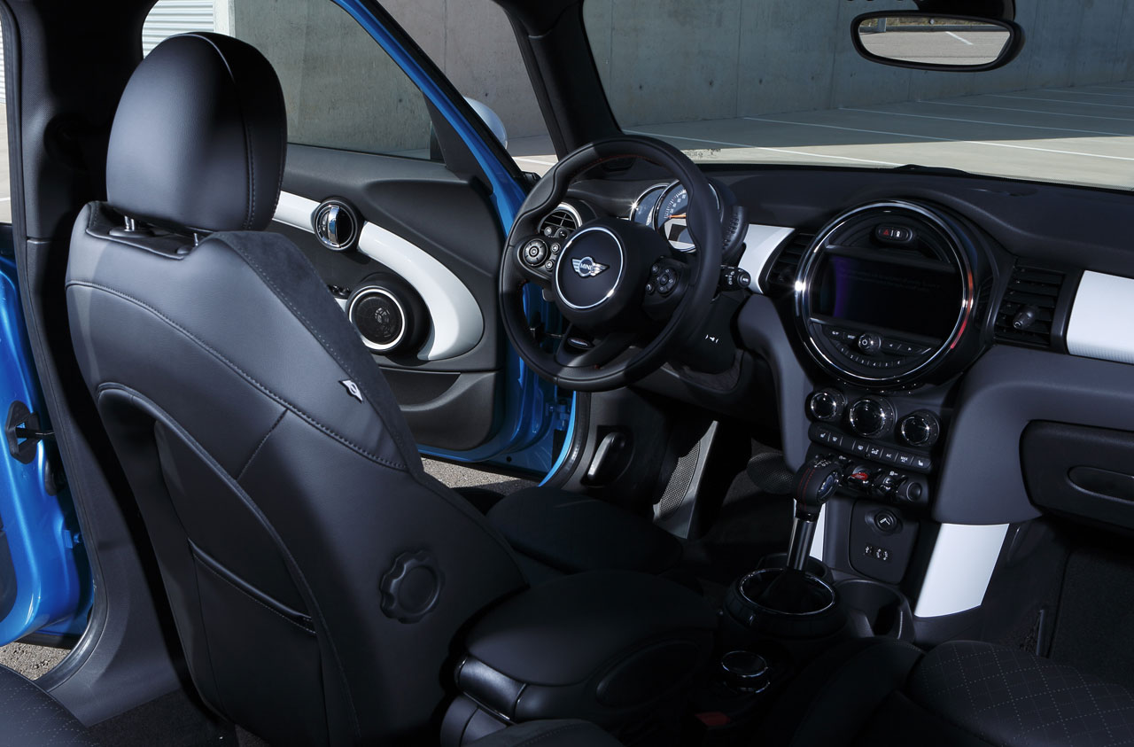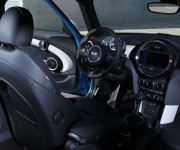 Nuovo concetto di visualizzazione e di comando: strumentazione combinata montata sul piantone dello sterzo con indicazione della velocità e del numero di giri; il display a colori visualizza lo stato della vettura e la riserva di carburante; strumentazione centrale con contenuti nuovi e rappresentazione a colori attraverso un anello a LED che fornisce un feedback ottico all’attivazione di numerose funzioni, equipaggiamento di serie con display TFT a quattro righe oppure, come optional, display a colori fino a 8,8 pollici; comando delle funzioni di navigazione, di entertainment, di telefonia e della vettura attraverso il MINI Controller montato sulla consolle centrale con feedback sul monitor di bordo; tasto Automatic Start/Stop nella consolle centrale al centro della modanatura con i tasti Toggle, attivabile senza inserire la chiave della vettura; tasti degli alzacristalli integrati nei pannelli interni delle porte; comando luci nella plancia portastrumenti.