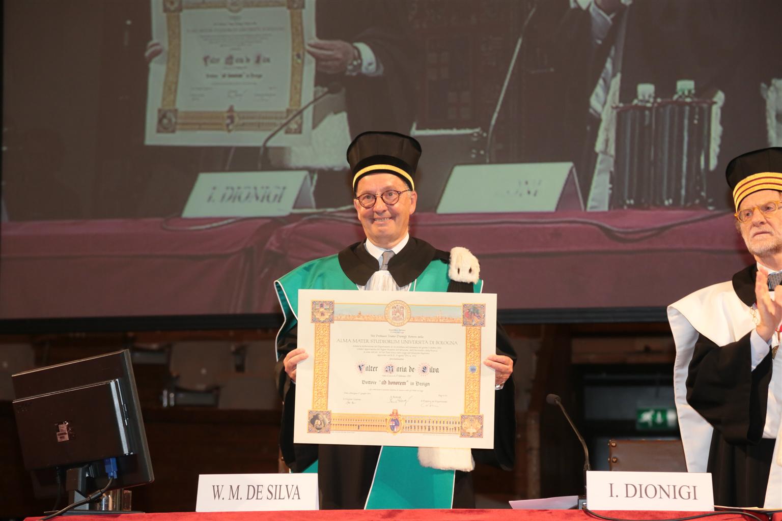 L’Università lo riconosce quale rappresentante del design italiano, che costituisce un valido esempio per tutti i professionisti del settore e, allo stesso tempo, per il suo ruolo come designer internazionale. “Il suo successo in Italia, in Spagna, in Germania e in tutto il mondo testimonia la portata globale del suo lavoro”. De Silva ha ricevuto numerosi riconoscimenti per il suo lavoro e ora, con la Laurea ad honorem, il suo nome sarà indissolubilmente legato a quello dell’Università Alma Mater Studiorum di Bologna.