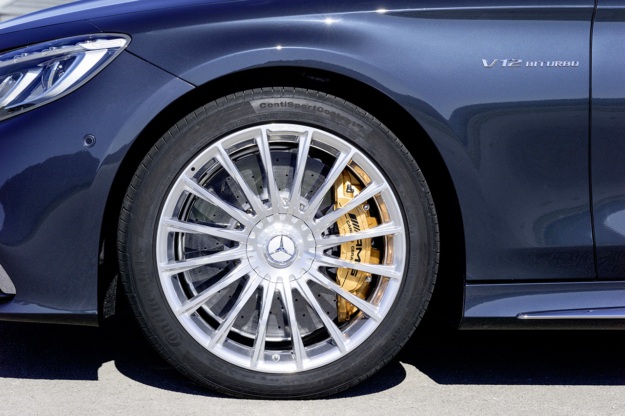 La S 65 AMG Coupé monta cerchi fucinati a razze nei formati 8,5 x 20 sull’asse anteriore e 9,5 x 20 sull’asse posteriore, con pneumatici 255/40 R 20 e 285/35 R 20. Gli esclusivi cerchi fucinati del Coupé V12 affascinano per il loro design del tutto particolare e rappresentano una moderna reinterpretazione dei classici cerchi delle auto sportive: ciascuna delle 16 razze ha una speciale curvatura e confluisce di taglio verso il centro del mozzo della ruota. Il risultato: un effetto ottico di ingrandimento dei cerchi.