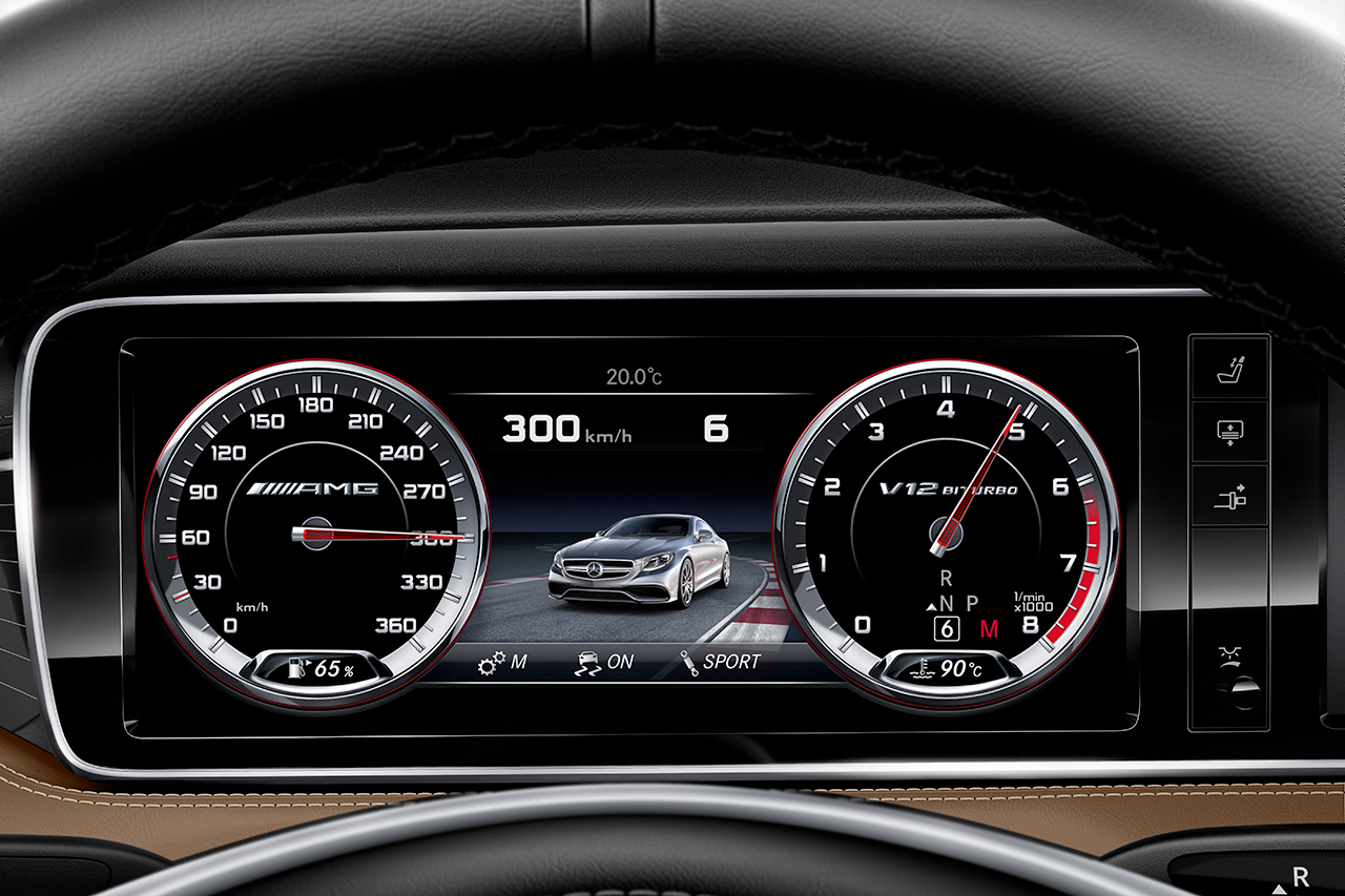 Un’altra peculiarità tipicamente AMG è rappresentata dalla strumentazione AMG: Sul display TFT a colori ad alta risoluzione da 31,2 centimetri, due strumenti circolari animati forniscono informazioni sul numero di giri del motore, sulla velocità di marcia e molto altro ancora. Nel look AMG si presentano anche la grafica specifica AMG e gli indicatori di colore rosso/argento, il tachimetro con scala fino a 360 km/h e la scritta ‘V12 BITURBO’ sul contagiri. All’apertura della porta lato guida, sul display destro viene visualizzata la videata iniziale AMG, mentre sulla strumentazione appare l’immagine animata di una S 65 AMG Coupé.