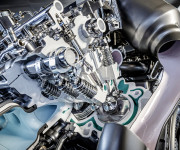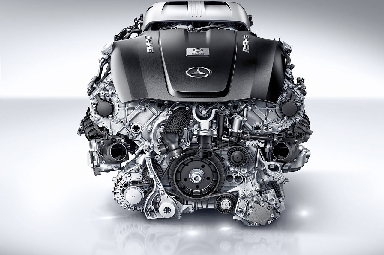Nel nuovo AMG V8 viene impiegata una sovralimentazione biturbo con cui i due compressori non si trovano all’esterno, sulle bancate di cilindri, ma tra di esse, nella V dei cilindri – in gergo tecnico si parla di “V interna calda”. I vantaggi sono una struttura compatta del motore, ottimi tempi di risposta e basse emissioni allo scarico. La lubrificazione a carter secco consente una posizione di montaggio del propulsore bassa, un abbassamento del baricentro e pone inoltre le premesse per elevate accelerazioni trasversali. Per queste ragioni il propulsore M178 di AMG è, a livello mondiale, il primo motore per vetture sportive con V interna calda e lubrificazione a carter secco. Inoltre, il nuovo AMG V8, con i suoi 209 kg di peso a secco, è il motore più leggero tra tutti i concorrenti in questo segmento.
