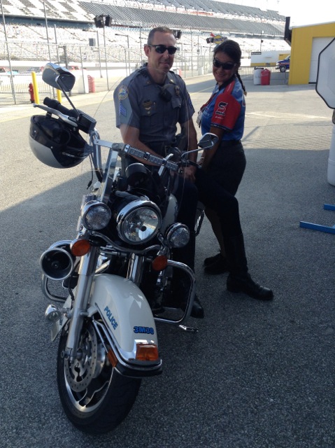 Giacccomo ci tiene a mettere in evidenza che Petty ha costruito nelle sede di Charlotte circa 120 macchine appositamente per il programma (la maggior parte sono state costruite negli anni ’90), tutte sono uguali e tutte montano un V6 Chevrolet da 600CV. Riesce a vendere al mio amico il programma ‘ride-along’ da passeggero, prezzo speciale per chi arriva presto la mattina! In pochi minuti, carta di credito alla mano, il mio amico è sistemato con tuta e casco con interfono pronto alla ‘ride-along’. Io devo andare per il briefing formativo in un’aula vicino alla pista. Incontro un poliziotto ipervitaminizzato sulla sua Harley (pure quella ipervitamizzata), subito lo stuzzico dicendo che se è li per fare multe si è trovato un lavoro troppo facile… lui, che sembra veramente uscito da un film di Terminator, sorride e mi dice che è sufficiente non passare il limite di 170 mph (limite massimo di velocità a cui sono tarate comunque le auto quando guidate da noi ‘piloti debuttanti’ – il programma che seguo e’ appunto denominato Rookie – per motivi assicurativi) e non ci saranno problemi. Anche lui fa chiaramente parte dell’entertainment nonostante sia di servizio, non si sa mai.