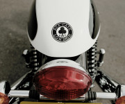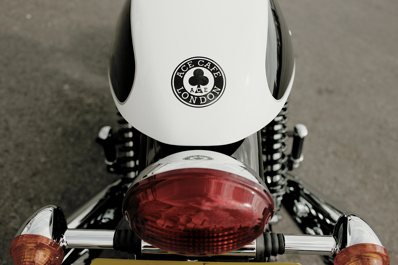 La Thruxton Ace ha le forme evocative di una vera Triumph Classic da corsa, con una originale livrea Pure White / Jet Black, che richiama i colori dell’Ace Cafè. La motocicletta è rifinita con i loghi di entrambi i brand posizionati su serbatoio, pannelli laterali e guscio coprisella.