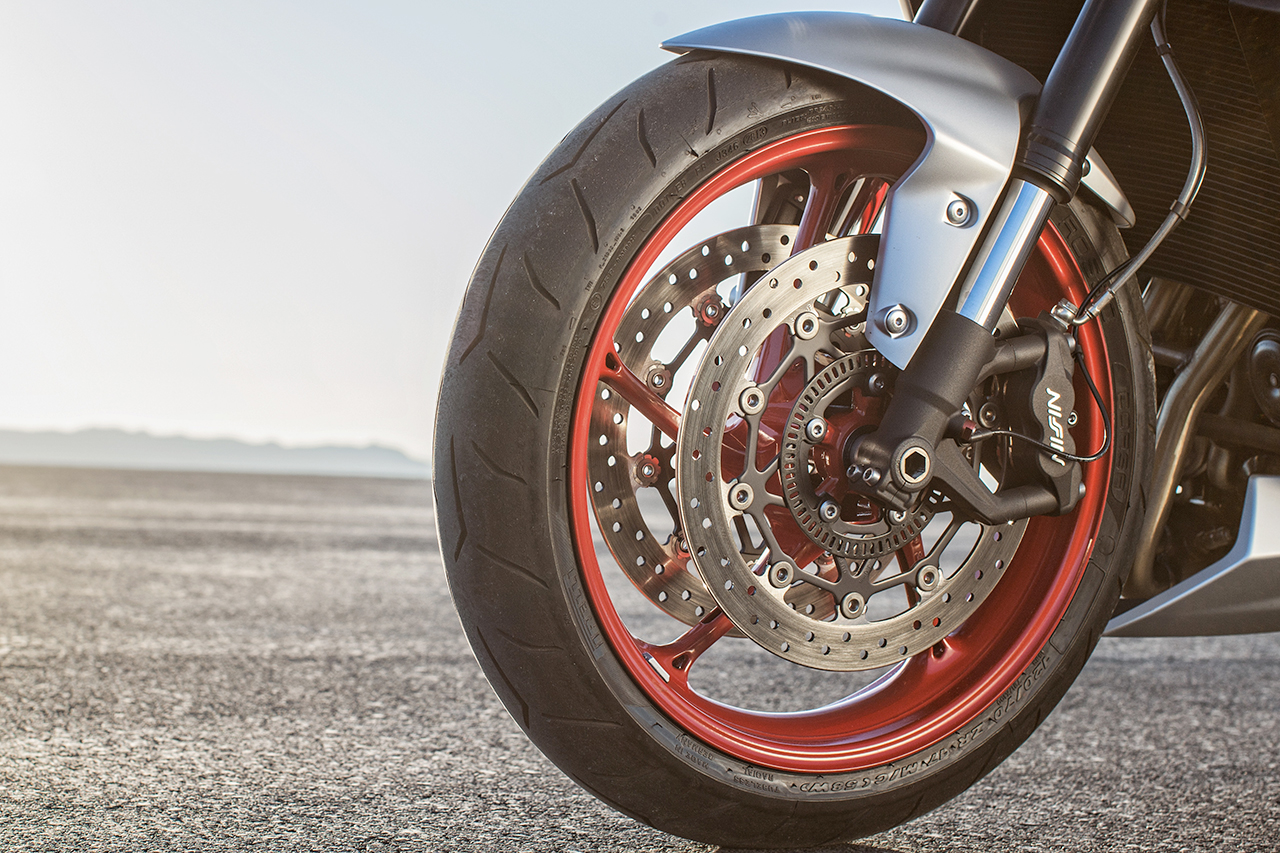 Le pinze sono delle radiali Nissin a quattro postoncini, l’ABS, di serie è disinseribile, e le forcelle sono delle KYB completamente regolabili.