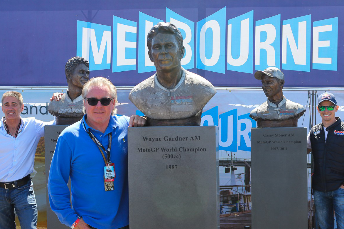 La statua dedicata a Casey Stoner posa di fianco a quella di Mick Doohan, Campione del Mondo della MotoGP, classe 500, dal 1994 al 1998 ed a quella di Wayne Gardner, Campione del Mondo della MotoGP classe 500 nel 1987.