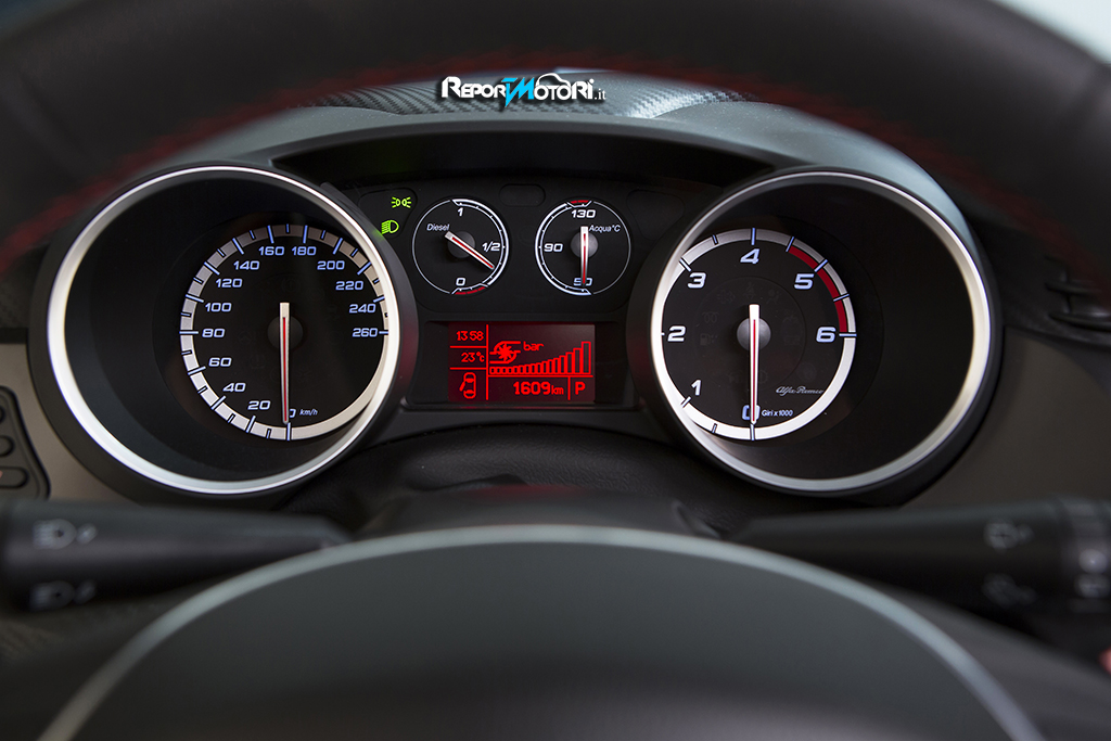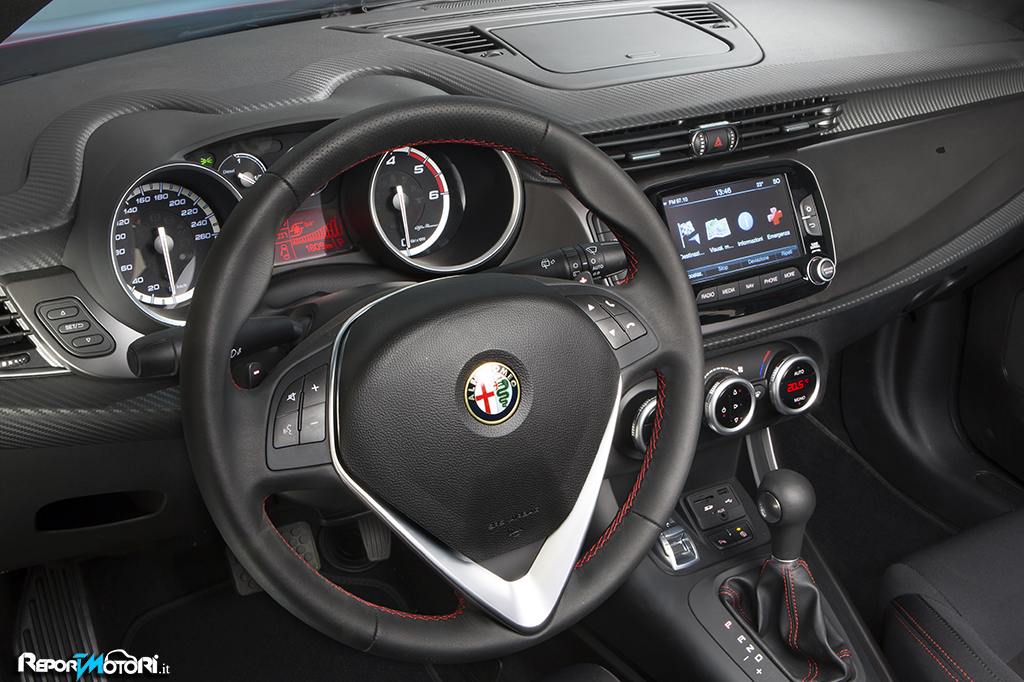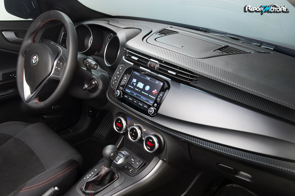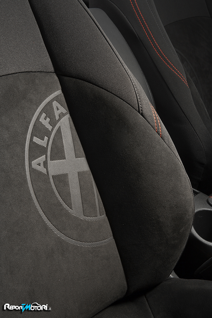 Internamente entusiasma il rivestimento carbon look della plancia, i sedili con tanto di logo Alfa con rivestimento in Alcantara, i pedali sportivi ed il pomello della leva del cambio in alluminio.