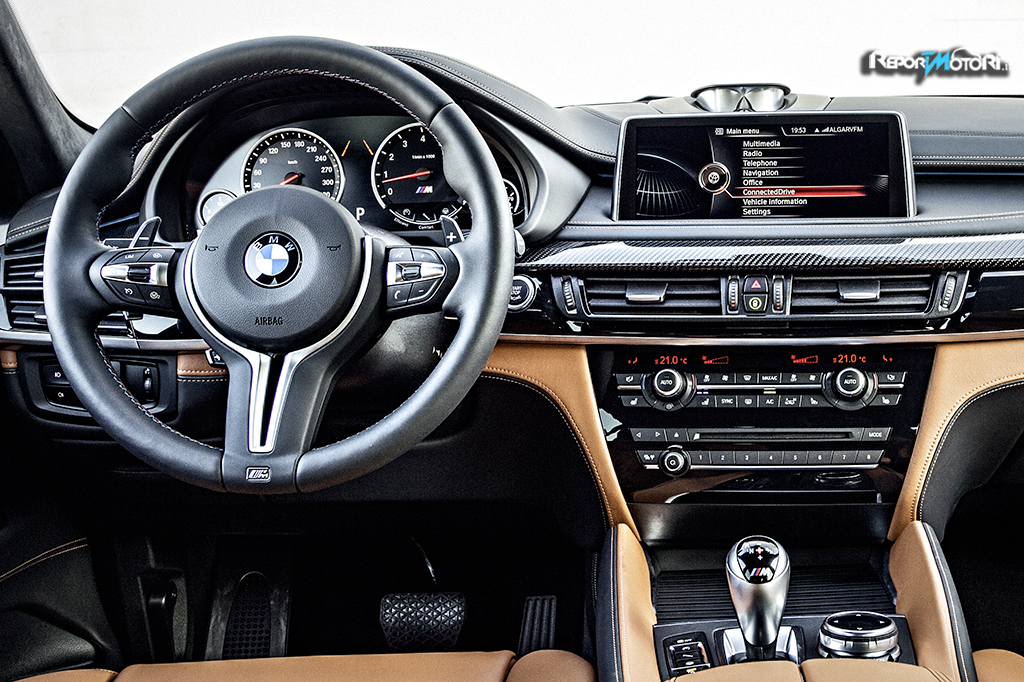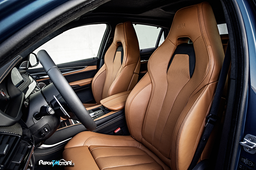 Nel frontale spiccano quattro grosse bocche d’aria, capaci non solo di dare respiro al potente V8 di 4,4 litri ma di assicurare alla nuova BMW X6 M un’estetica aggressiva, un look tipico da EMME ed al tempo stesso, di regalarle valori di portanza degni di una supersportiva.