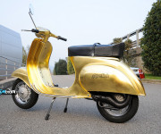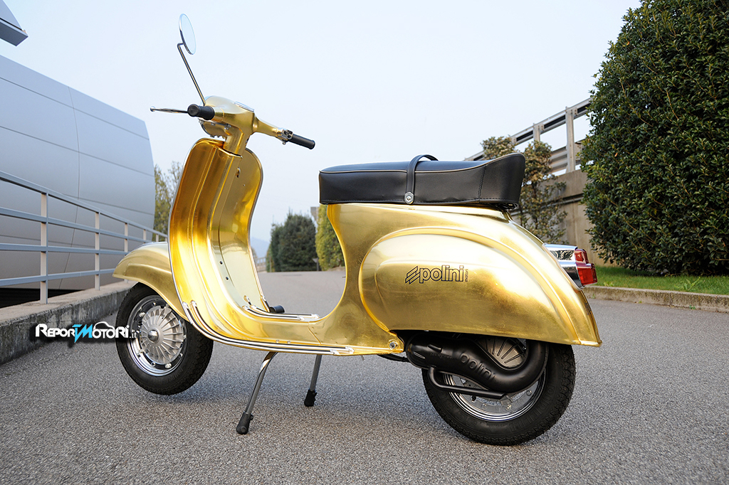 500 foglie di oro zecchino da 23 carati compongo l’estetica esclusiva della Vespa Polini oro 23 Carati, un’idea folle, bizzarra, realizzata per l’edizione 2014 dell’Eicma.