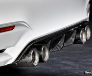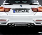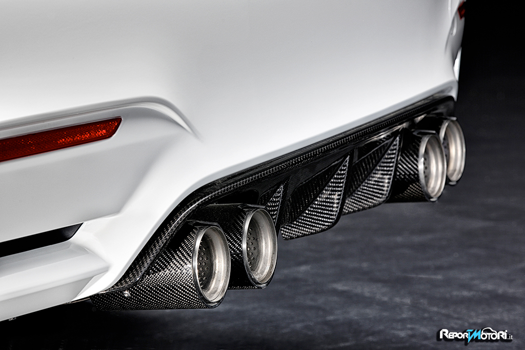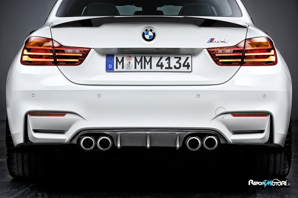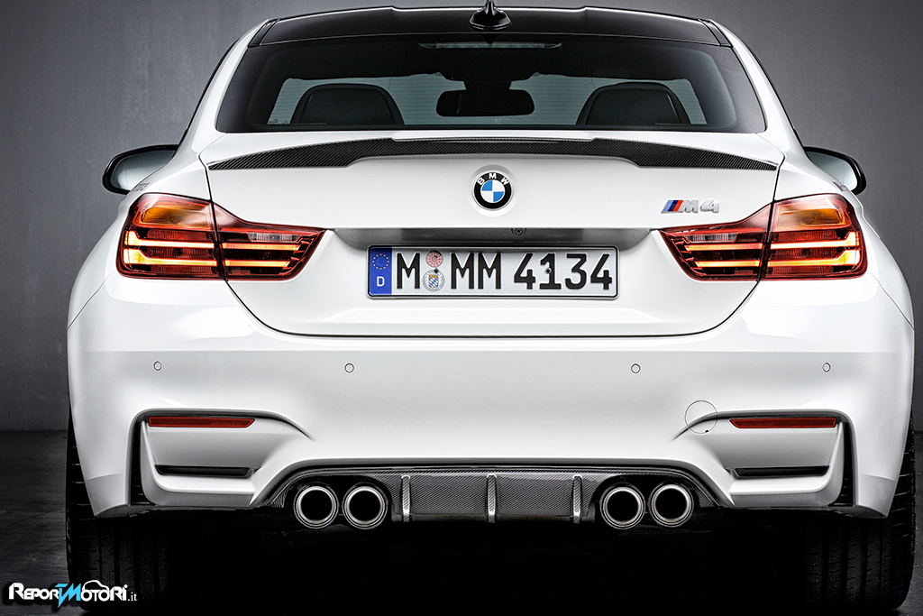 Il leggero sistema di scarico dei deviatori con controllo delle alette comprende uno scarico in acciaio inox ed un silenziatore realizzato completamente in titanio che presenta la scritta BMW M Performance quando viene osservato dal retro della vettura.