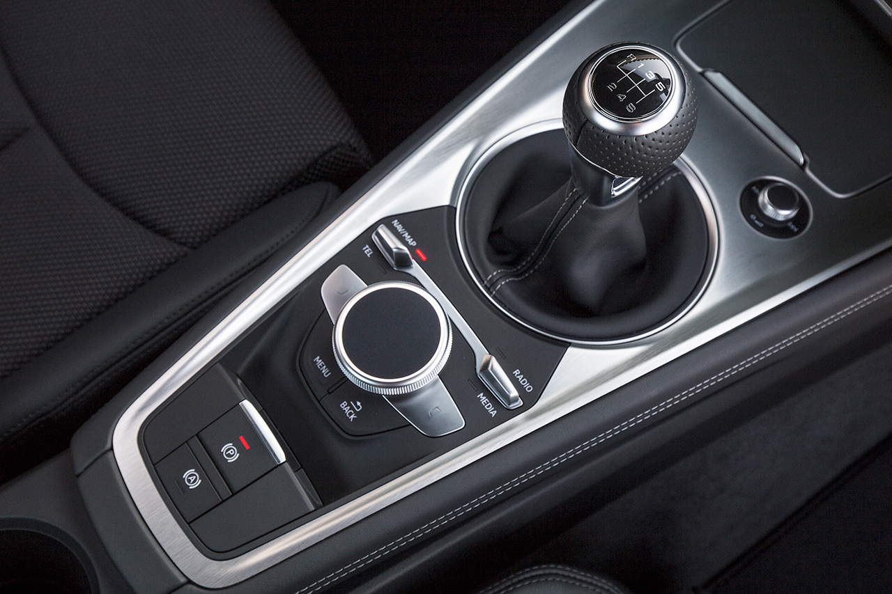 assetto sportivo S line, listelli sottoporta con logo S line, interni, cruscotto e cielo abitacolo di colore nero con cuciture in contrasto, inserti in alluminio opaco spazzolato, volante sportivo multifunzionale in pelle S line a 3 razze con cuciture in contrasto e logo
