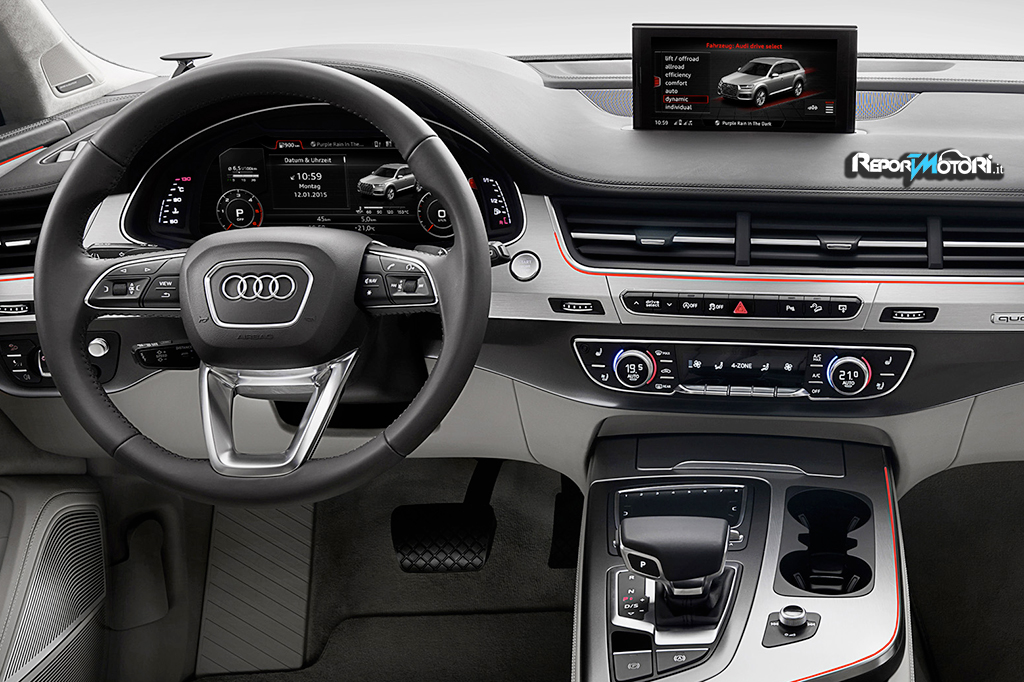 La gestione tramite MMI di ultimissima generazione di Audi Q7 consente di controllare facilmente una serie di pratiche e nuove funzioni. L’innovativa ricerca MMI con le sue proposte intelligenti semplifica la ricerca di determinati brani musicali nonché l’inserimento di contatti telefonici o destinazioni di navigazione, rendendo così notevolmente più rapido il comando. Infatti, quasi tutti gli inserimento si eseguono con poche operazioni; due menu integrativi contengono funzioni e opzioni collegate in modo intelligente. E, anche in questo campo, Audi definisce un nuovo parametro di riferimento.