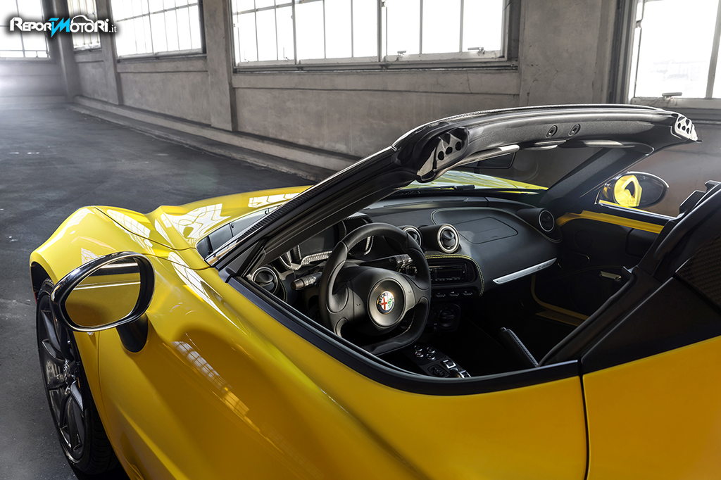 Grazie alla rigidità insita nella monoscocca, i tecnici Alfa Romeo hanno potuto ridurre al minimo le differenze strutturali fra la 4C Spider e la 4C Coupé. Per garantire alla 4C Spider look tecnico, robustezza del gruppo anteriore e baricentro basso, la vettura è dotata un anello parabrezza unilaterale in fibra di carbonio che aderisce e viene agganciato al telaio monoscocca. Inoltre, un roll-bar in alluminio con una copertura speciale (nera o, a richiesta, in fibra di carbonio) fornisce i punti d’attacco per il nuovo portellone posteriore, mentre gli esclusivi sostegni superiori della scocca e la traversa rinforzata in acciaio del vano motore aumentano al massimo la rigidità torsionale.