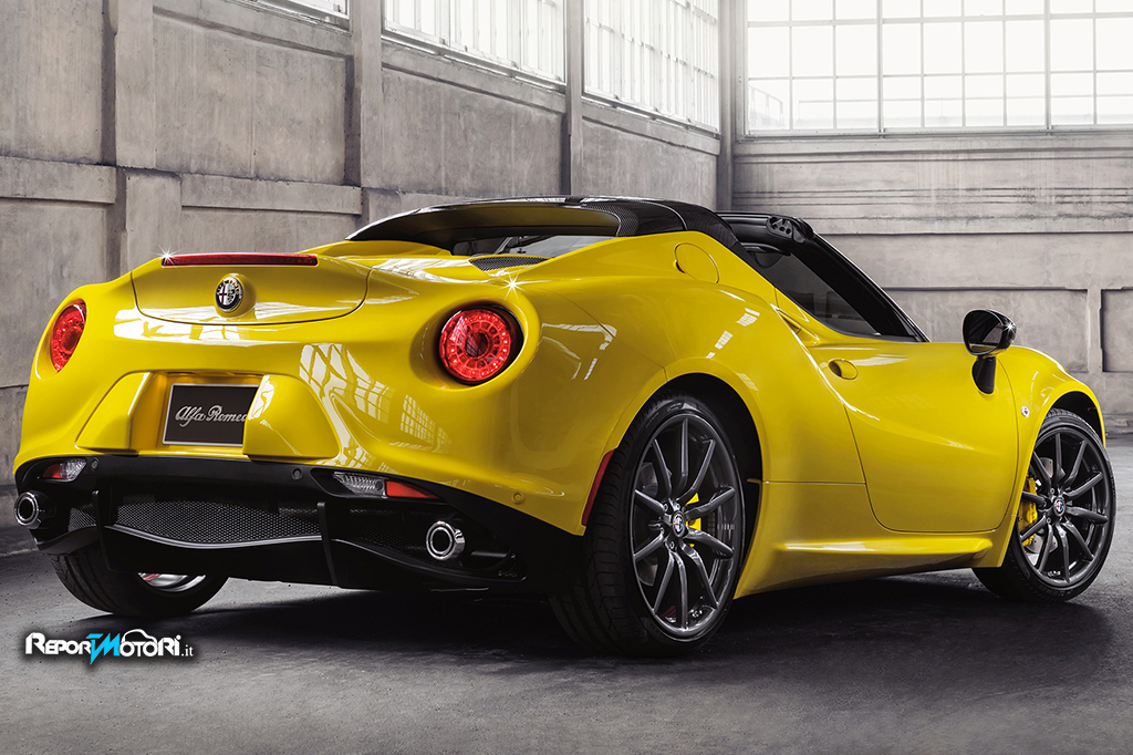 Il “cuore pulsante” di questa supercar italiana è avvolto da una struttura funzionale oltre che estetica, formata da tre estrattori di calore e dall’alettone aerodinamico. A partire dal “cuore pulsante” della 4C Spider prendono forma tutti gli altri elementi di design della vettura: gli aggressivi rivestimenti laterali avvolgono il cofano posteriore elevando la scocca sopra la linea di cintura dell’abitacolo per conferirle un aspetto ancora più imponente e per delineare l’inizio della copertura del roll-bar nera o in fibra di carbonio. La fascia posteriore, unitamente ai fanali tondi a LED, si fonde nelle muscolature per aumentare la sensazione di potenza, incorporando con stile le grandi e funzionali prese d’aria che raffreddano il motore. Più in basso, i doppi scarichi montati agli angoli sottolineano l’aspetto da supercar della 4C Spider. Ispirato da quello realizzato per il 4C Spider Concept, il nuovo impianto di scarico centrale, prestazionale dual-mode Akrapovic sarà disponibile dopo il lancio.