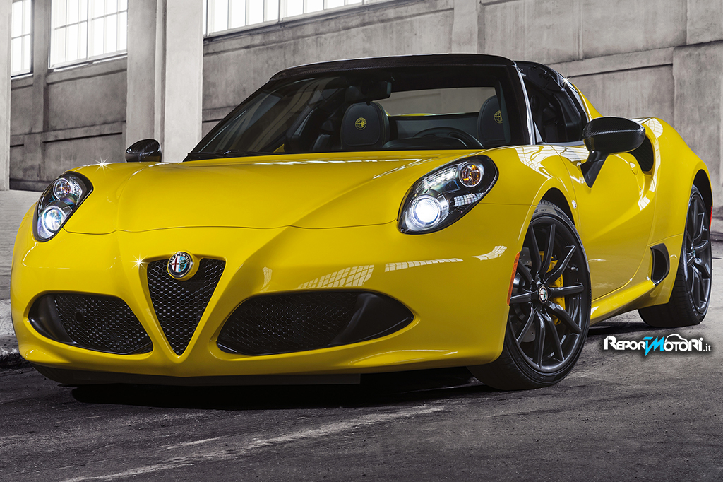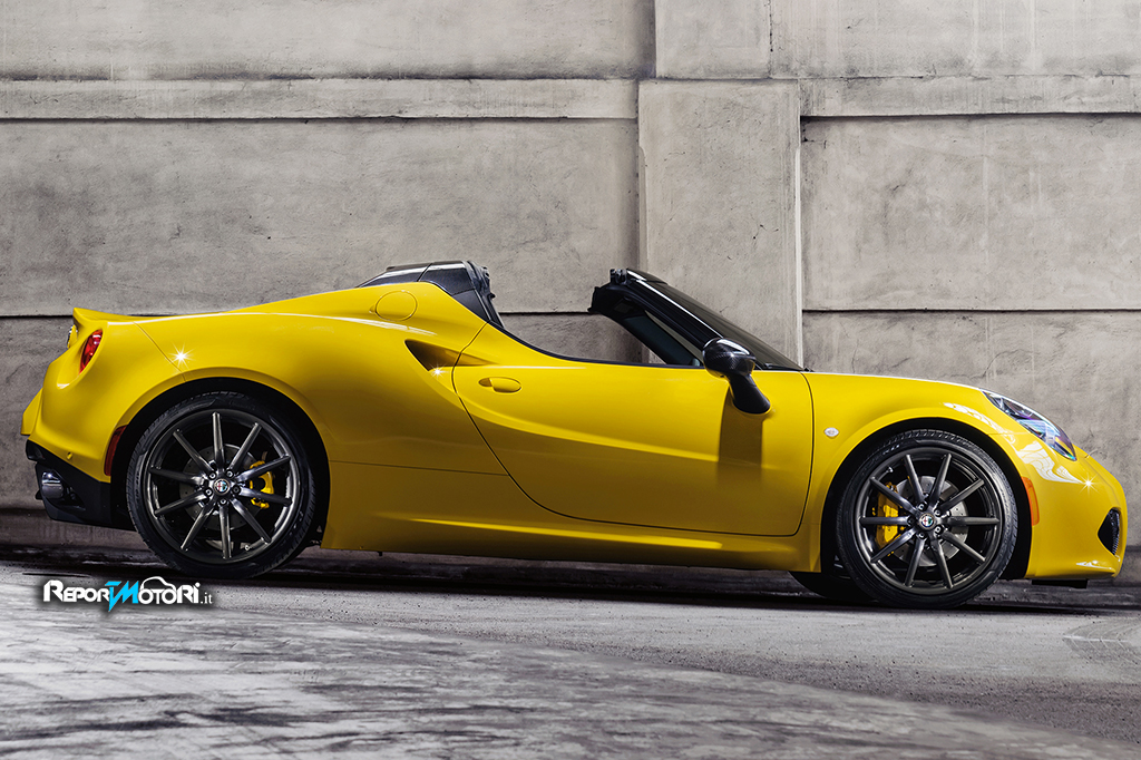 La 4C Spider è disponibile in sette colori di carrozzeria: Rosso Alfa, Nero, Bianco, Grigio Basalto (metallizzato), Rosso Competizione (tristrato), Bianco Madreperla (tristrato) e il nuovissimo Giallo.