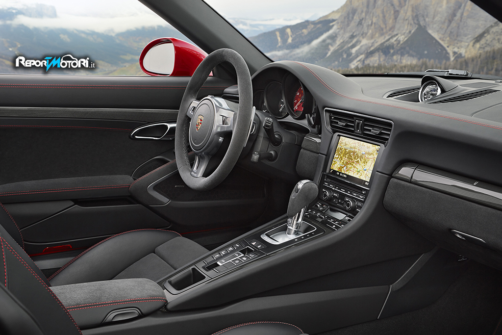 Il DNA della GTS caratterizza anche gli interni della 911 Targa 4 GTS. Il cronometro del pacchetto Sport Chrono è integrato centralmente nella strumentazione. I sedili sportivi Plus con regolazione a 4 vie e scritta GTS in colore nero sui poggiatesta assicurano un ottimo contenimento laterale e un elevato livello di comfort sui lunghi tragitti, sia per il guidatore che per il passeggero. Nell’abitacolo domina l’Alcantara nera, che pesa solo la metà della pelle.
