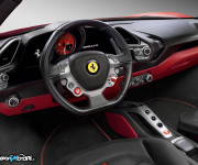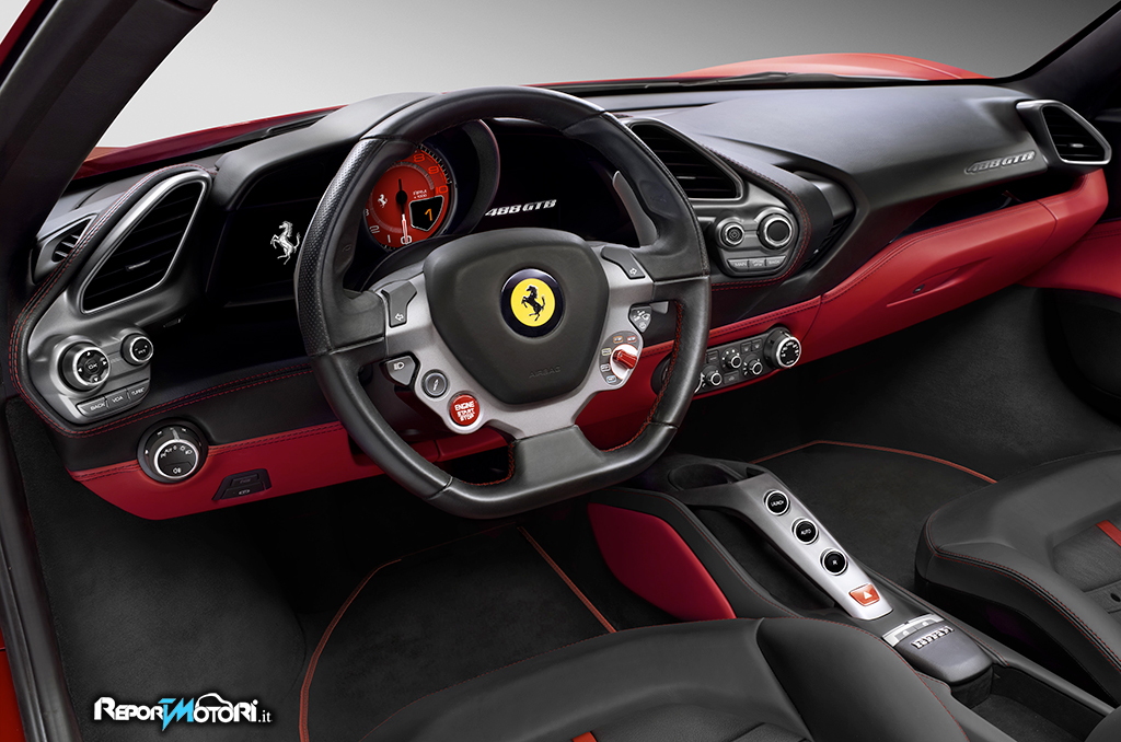 In abitacolo l’integrazione tra i nuovi comandi a satellite, i diffusori aria inclinati e il quadro rafforza l’effetto di un vero e proprio cockpit cucito attorno al pilota creando un’atmosfera di sportività estrema senza sacrificare il comfort. Tipici della tradizione Ferrari sono elementi quali la netta separazione tra plancia e tunnel, il volante multifunzione, il bridge comandi e i sedili avvolgenti. Completamente rivista la grafica e l’interfaccia del sistema infotainment, mentre per la prima volta la chiave vettura ispirata alla forma dei polmoni di aspirazione motore assume la funzione “keyless start”.