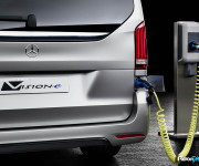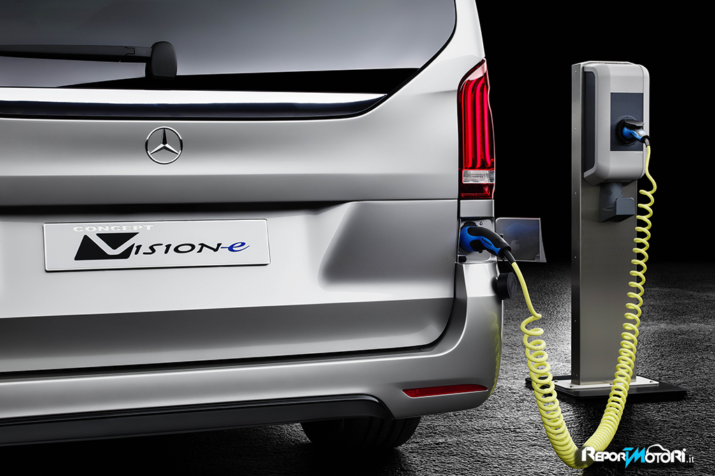 L’energia elettrica della Mercedes Concept V-ision e, è accumulata in una batteria agli ioni di litio ad alto voltaggio, con capacità complessiva di 13,5 kWh. La batteria è sistemata nel bagagliaio, all’interno di un contenitore in lamiera d’acciaio rivestito. La batteria ad alto voltaggio è ricaricabile da una sorgente esterna, in tal modo contribuisce efficientemente ai bassi valori di consumo e di emissioni. Grazie ad un intelligente sistema on board, la ricarica avviene in meno di due ore, con alimentazione tramite wallbox o colonnina pubblica (400 V, 7,2 kW, monofase). In alternativa si può utilizzare anche la normale presa domestica. A seconda della rete, la ricarica si completa poi in circa cinque ore (a 230 V, 13 A, 3,0 kW, monofase).