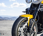La Speed 94R porta il concept della Speed Triple ad un livello superiore, con una ciclistica ancora più performante. La versione R è dotata di un sistema di sospensioni Ohlins completamente regolabili e anodizzate nere. All’anteriore monta Ohlins NIX30 da 43mm mentre al posteriore monta un ammortizzatore Öhlins TTX36. L’impianto frenante è composto da pinze radiali Brembo con sistema antibloccaggio, reso ancora più efficace dalle gomme Pirelli Supercorsa SP montate di serie.