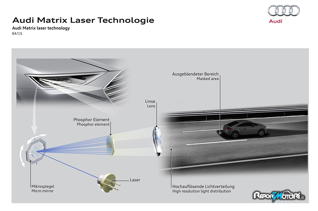 La tecnologia Matrix Laser è basata su uno spot Laser per le luci abbaglianti, che Audi ha introdotto nella produzione sul modello R8 LMX. Per la prima volta, si è così riusciti a integrare la tecnologia di proiezione della luce laser in un gruppo ottico compatto e potente. La nuova tecnologia opera grazie a micro-specchi in rapido movimento, che reindirizzano il raggio laser.