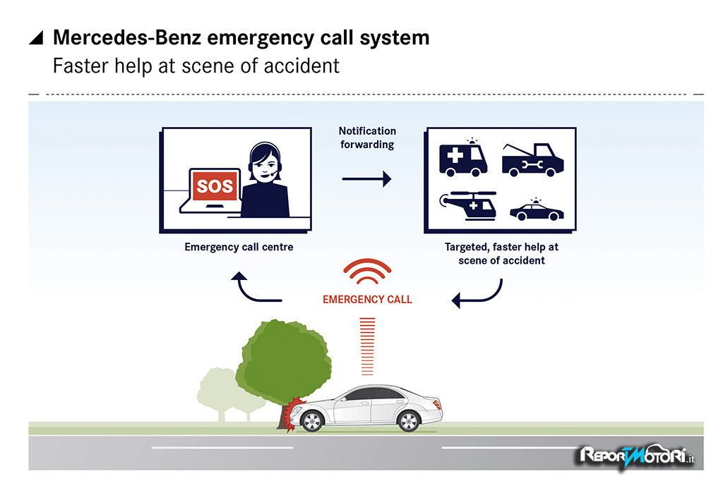 Una volta avviata una chiamata d’emergenza, la centrale di soccorso Mercedes-Benz verifica se sia necessaria assistenza sul posto e, nelle situazioni di emergenza, inoltra immediatamente i dati della chiamata – posizione GPS, direzione di marcia, l’ora della chiamata e l’impostazione della lingua impostata nei sistemi multimediali della vettura – a una centrale di soccorso pubblica europea. Le misure per il soccorso, il salvataggio o il traino fino a un Punto di Assistenza Mercedes-Benz possono così essere avviate il prima possibile.