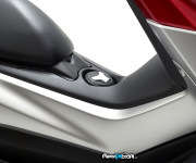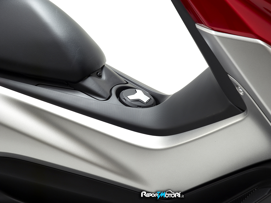 Sotto la sella dello Yamaha NMAX c’è un ampio vano che può ospitare un casco integrale e altri piccoli oggetti. La doppia sella è dotata di un meccanismo a molla che la mantiene sollevata mentre si accede al portaoggetti.