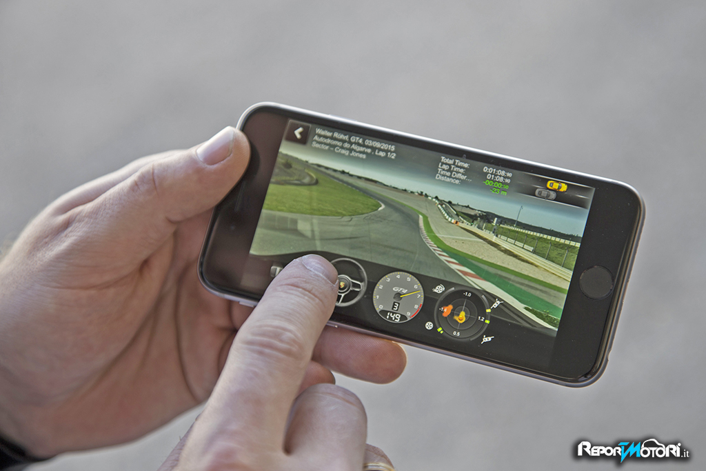 Poiché tutte le registrazioni dati e video vengono salvate nello smartphone, è possibile produrre un’analisi video immediatamente dopo l’arresto della vettura, consentendo al pilota di migliorare le proprie prestazioni già nel giro successivo. Una caratteristica unica è il display nel cockpit animato, specifico per la 911 GT3 o la Cayman GT4, con un volante sincronizzato con il video e i pedali di acceleratore e freno simulati. Sono visualizzati praticamente quasi tutti i dati di guida: regime del motore, marcia inserita, velocità, angolo di sterzata, comportamento in frenata e accelerazione, accelerazione longitudinale e trasversale (G-force) nonché trazione e sovra/sottosterzata.
