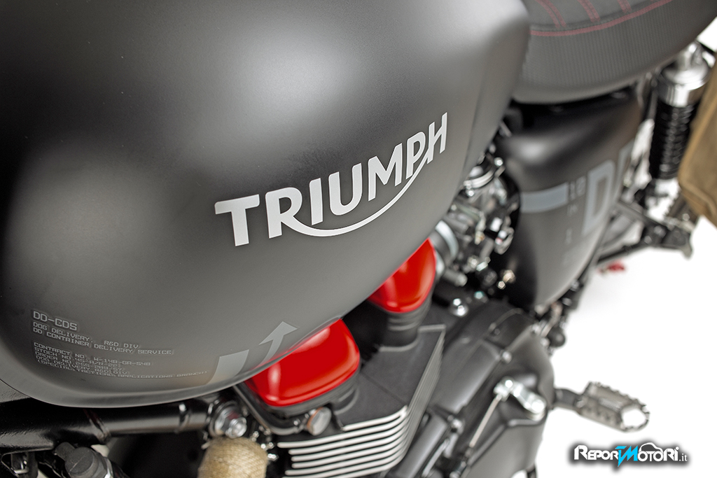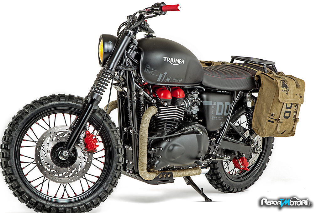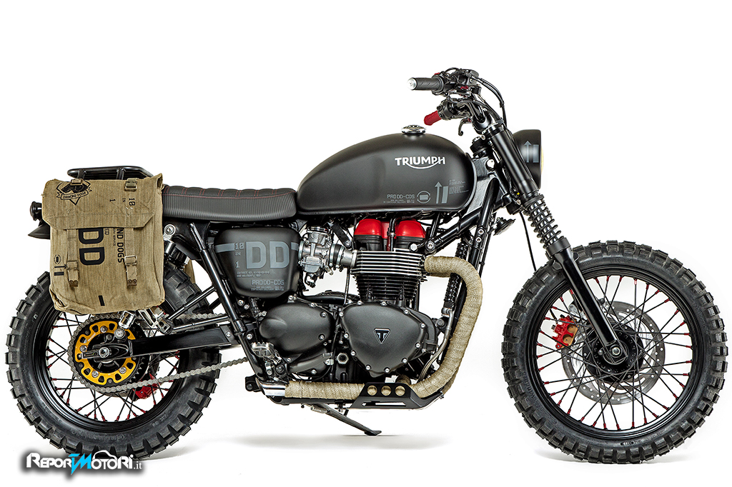 Il faro anteriore giallo della JVB e le molle esterne delle forcelle donano uno stile ancor più aggressivo alla parte frontale, caratterizzata dall’assenza del parafango. Mentre la personalità della moto risalta nella parte posteriore, dove il parafango tagliato e il fanale aggiungono una forte esclamazione di carattere. Le pinze e la cover valvole sono in tinta e donano un ulteriore tocco di stile, mentre gli scarichi tagliati offrono una colonna sonora che da vita all’intero look. I dettagli come le pedane da off-road della Triumph Tiger, il pignone ad alte prestazioni, i tappi del corpo farfallato anodizzati e le leve sportive Triumph, contribuiscono a rendere questa moto unica tanto quanto il suo pilota.