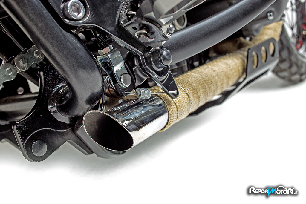 I percorsi off-road sono facili da affrontare grazie a cerchioni custom e pneumatici Continental TKC80s appositamente studiati per lo sterrato. La sella di serie è stata sostituita e rifinita in Sneaking Suit, con pelle in neoprene e Carbon Kevlar, proprio come l’iconica uniforme di Snake. Un portamunizioni resistente è installato sul retro della sella, offrendo maggiore protezione e un supporto aggiuntivo per eventuali munizioni extra calibro 50.