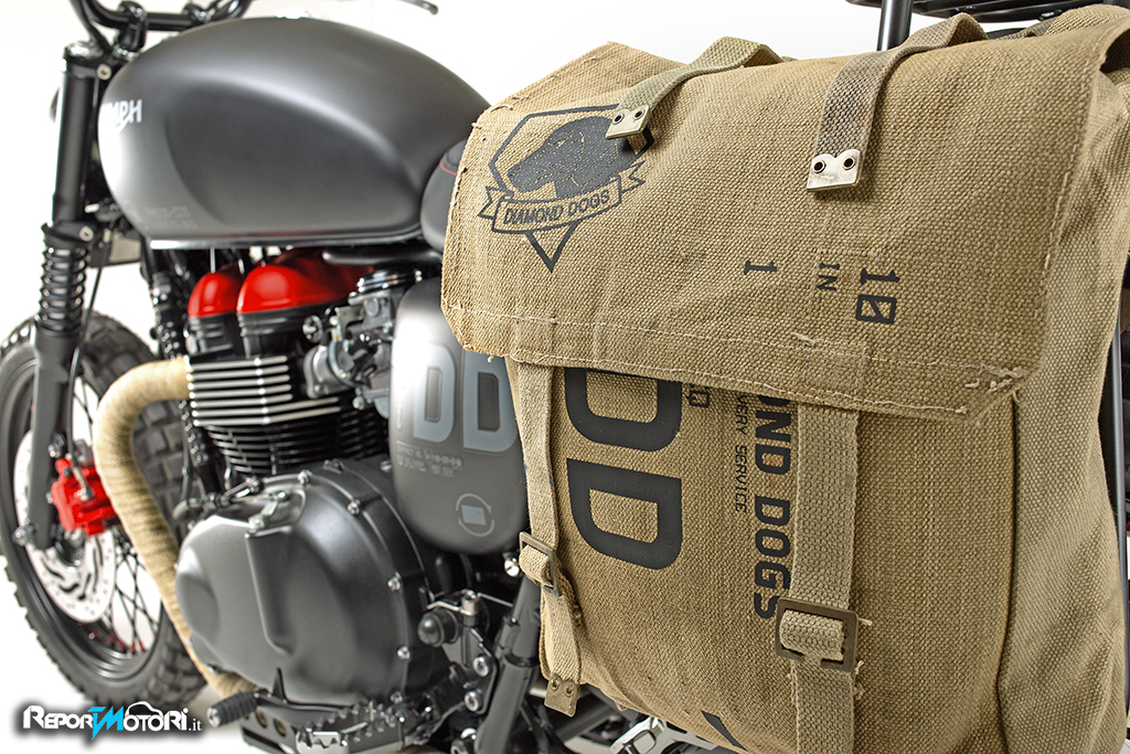 Ma una moto perfetta per un mercenario, ex soldato delle forze speciali, doveva essere forgiata a dovere: ottimizzata, personalizzata e sviluppata. Il leader dei Diamond Dogs non ha bisogno di sottigliezze da civili. Così sono stati eliminati specchietti, contachilometri, e contagiri, lasciando spazio solo all’essenziale. Una Bonneville T100 si è evoluta in una hot rod estrema.