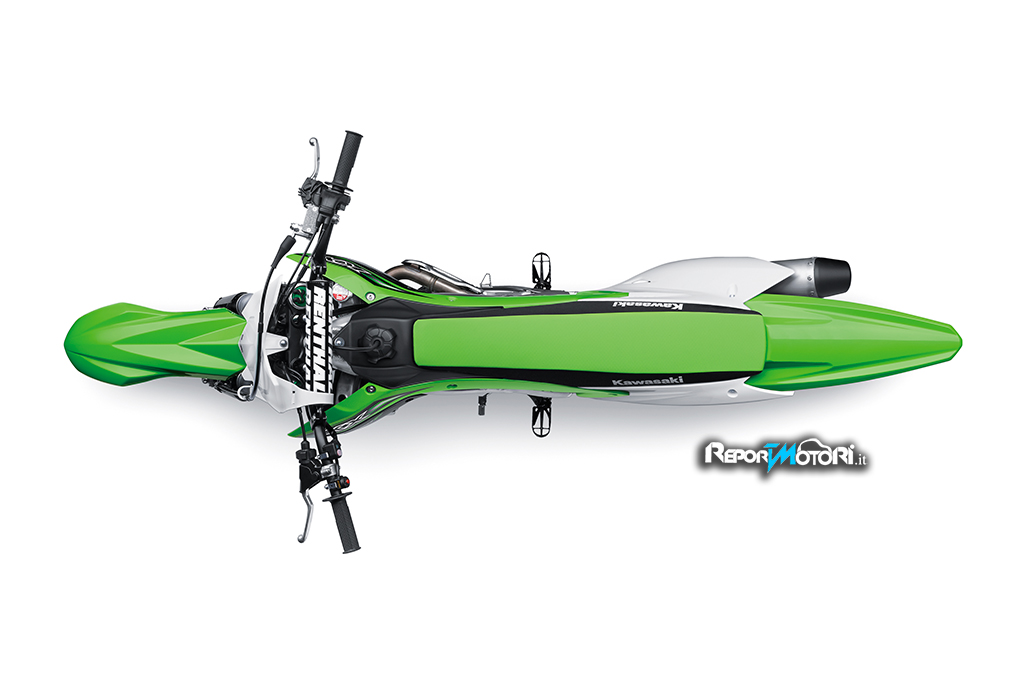 La nuova KX450F my2016 sfoggia un nuovo look racing con plastiche minimaliste, convogliatori del radiatore più piccoli, sella e serbatoio più piatti per facilitare il movimento del pilota.