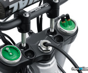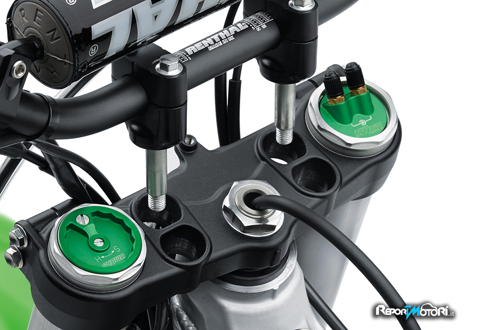 Oltre allo chassis estremamente snello e leggero, la forcella SFF-Air Tac Race-Ready rimane una delle caratteristiche chiave della KX450F. Metalli pregiati come titanio e alumite completano la costruzione in alluminio leggero per diminuire l’atrito e l’usura. La forcella da 49mm dona la giusta rigidità e robustezza. Questa forcella ad elevate prestazione ha un setting range molto ampio per adattarsi a qualunque tipo di pista e di pilota.