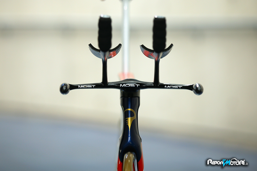 La Pinarello Bolide HR adotta un manubrio monoblocco in titanio completamente riprogettato per ottimizzare l’interazione di Wiggins con la bicicletta. Per l’occasione è stata utilizzata la Laser Sintering Technology per creare un manubrio in titanio fortemente sagomato, in virtù della rimozione dei freni, delle leve del cambio e dell’innovativo bracciolo ideato per ridurre la pressione e la resistenza dell’aria.