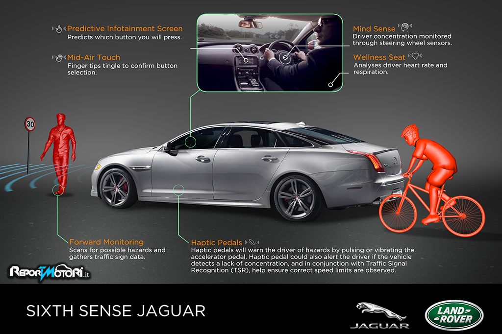 Jaguar Land Rover sta valutando come controllare il benessere del guidatore tramite un sensore medicale posto nel sedile di una Jaguar XJ. Questo sensore, in origine sviluppato per uso medico, è stato adattato all’impiego automobilistico e rileva le vibrazioni del battito cardiaco e della respirazione del pilota.