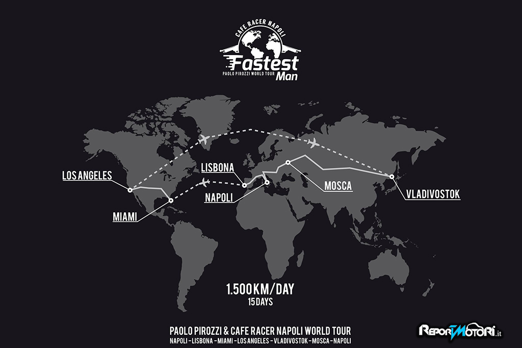 Paolo Pirozzi, colui che ha percorso oltre 500.000 km in sella ad una Ducati, si appresta a compiere un qualcosa che ha dell’incredibile: in soli 15 giorni effettuerà il giro del mondo in moto, in sella ad una Ducati realizzata dalla CRN Café Racer Napoli.